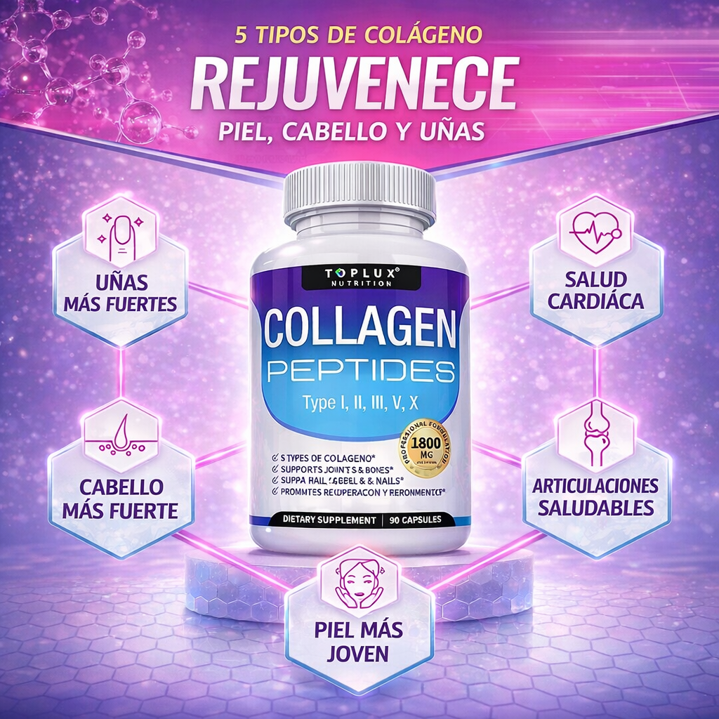 Nuestra fórmula contiene 5 tipos de colágeno y está enriquecida con vitamina C, ácido hialurónico y minerales esenciales, lo que mejora la absorción y potencia los resultados en piel, articulaciones y cabello.